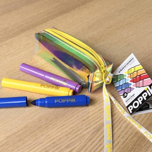 Cette trousse fantaisie aux reflets irisés contient 12 feutres à dessin, à utiliser sur tous les supports. Encre lavable à l’eau. 12 couleurs différentes.